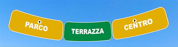 Avete la possibilità di visitare tre ambienti: Terrazza, Parco e Centro. In ogni ambiente avete questa segnaletica. Cliccando sulla freccetta vi spostate da un ambiente all'altro.